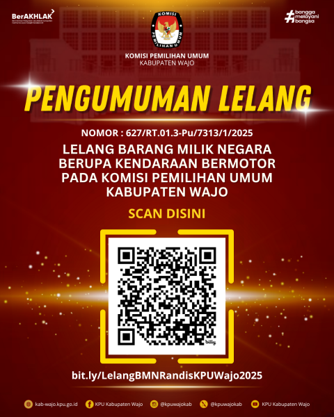 Komisi Pemilihan Umum Kabupaten Wajo dengan perantaraan Kantor Pelayanan Kekayaan Negara dan Lelang (KPKNL) Parepare akan melaksanakan Lelang Barang Milik Negara (BMN) berupa Kendaraan Bermotor sebanyak 8 Unit, antara lain Mini bus 3 unit dan Sepeda Motor 5 Unit. Selengkapnya klik disini!