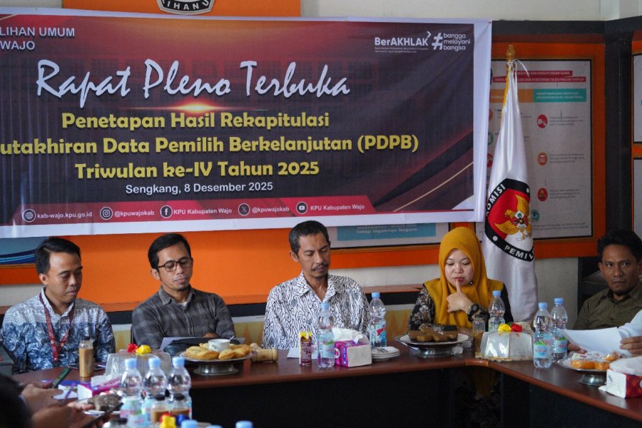 KPU Wajo kemudian menyerahkan hasil resmi rekapitulasi sebagaimana tertuang dalam Berita Acara Nomor: 332/PP.07.BA/7313/2025 tanggal 8 Desember 2025. Berdasarkan berita acara tersebut, jumlah pemilih berkelanjutan Triwulan IV Tahun 2025 ditetapkan sebanyak 300.945 pemilih, terdiri dari 143.803 laki-laki dan 157.142 perempuan.