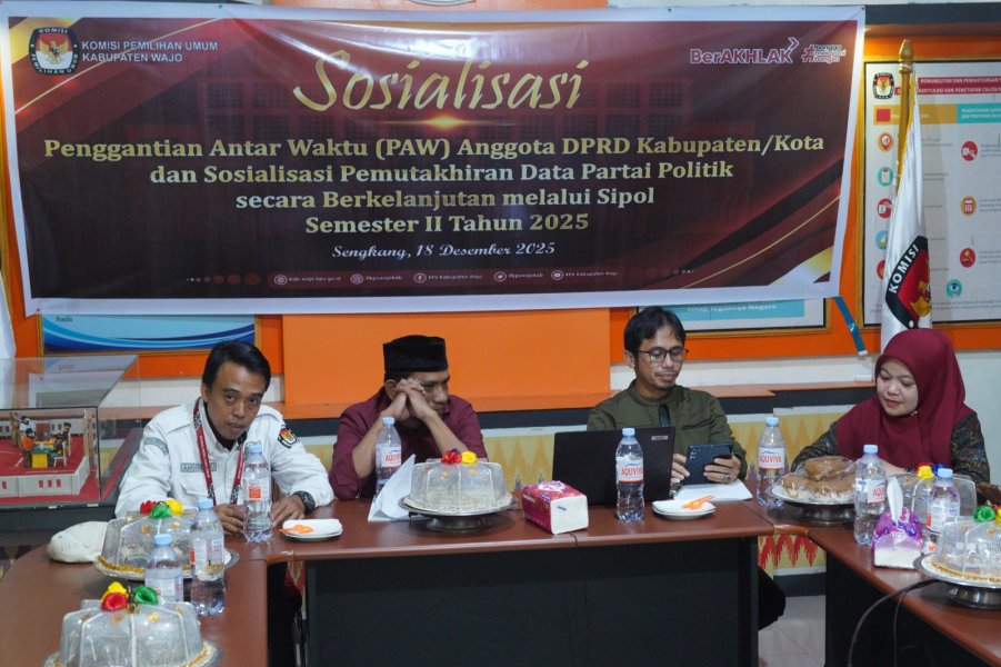 Komisi Pemilihan Umum (KPU) Kabupaten Wajo melaksanakan kegiatan Sosialisasi Penggantian Antar Waktu (PAW) Anggota DPRD Kabupaten Wajo serta Sosialisasi Pemutakhiran Data Partai Politik secara Berkelanjutan melalui Sistem Informasi Partai Politik (Sipol) Semester II Tahun 2025. Kegiatan tersebut berlangsung di Rumah Pintar Pemilu (RPP) KPU Kabupaten Wajo pada Kamis, 18 Desember 2025.