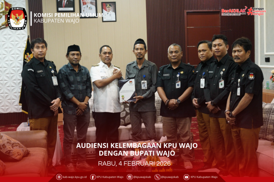 Sengkang – Komisi Pemilihan Umum (KPU) Kabupaten Wajo melaksanakan audiensi dengan Bupati Wajo, Andi Rosman, pada Rabu, 4 Februari 2026, bertempat di Kantor Bupati Wajo. Audiensi ini dilaksanakan dalam rangka menjaga sinergitas kelembagaan serta dukungan pelaksanaan kegiatan non tahapan Pemilu dan Pemilihan, sekaligus menyerahkan Buku Laporan Penyelenggaraan Pilkada kepada Bupati Wajo.