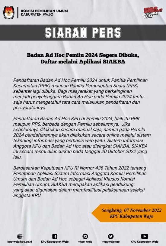 WAJO, Pendaftaran Badan Ad Hoc Pemilu 2024 untuk Panitia Pemilihan Kecamatan (PPK) maupun Panitia Pemungutan Suara (PPS) sebentar lagi dibuka.