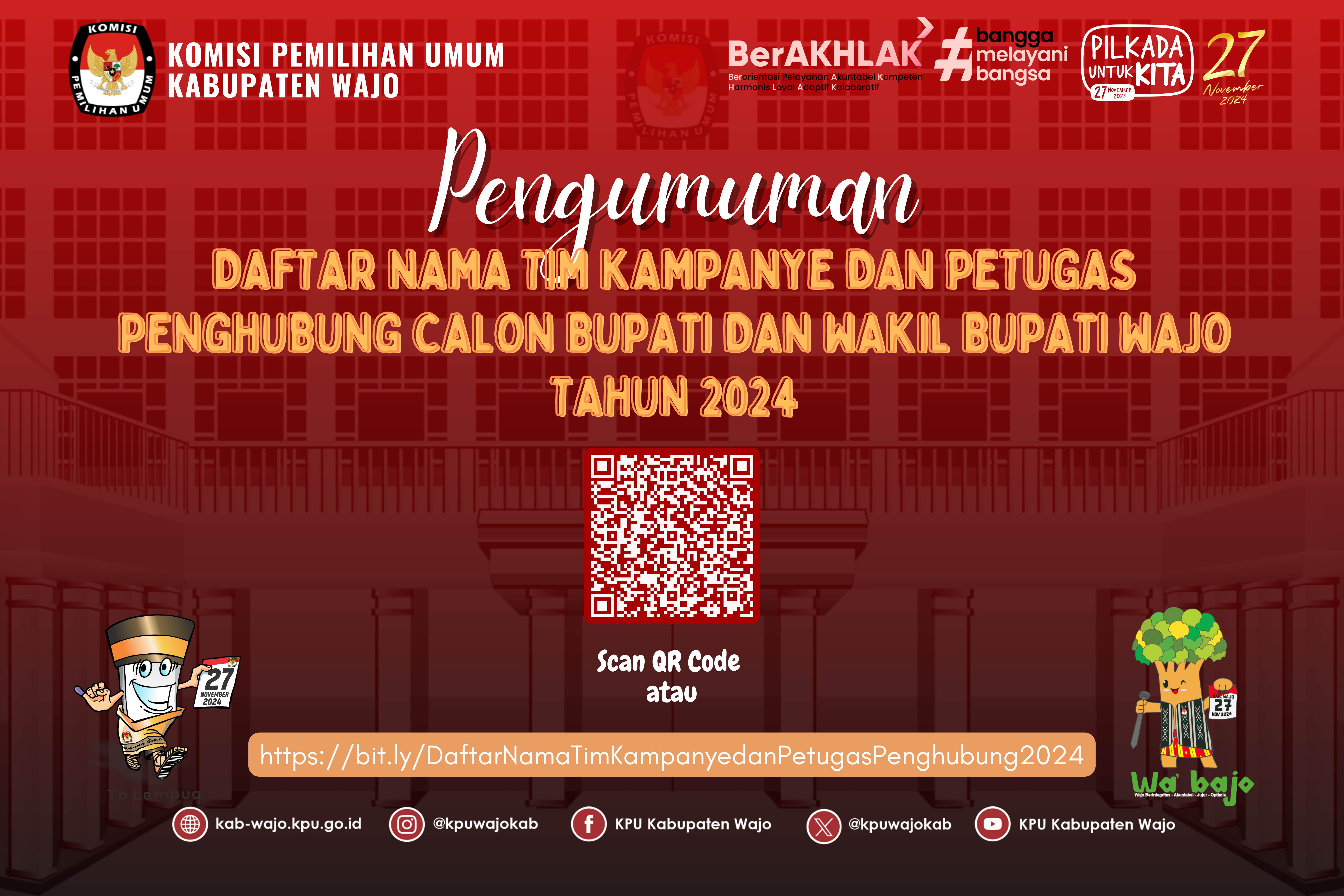 Pengumuman Daftar Nama Tim Kampanye dan Petugas Penghubung Calon Bupati dan Wakil Bupati Wajo Tahun 2024 dapat disimak dan di unduh pada link berikut (KLIK DISINI)
