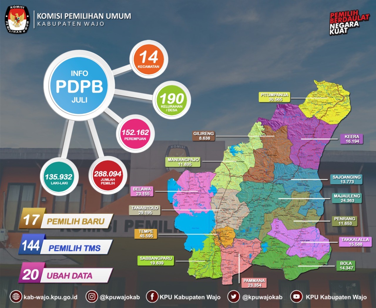 Hasil Pemutakhiran Data Pemilih Berkelanjutan yang ditetapkan dalam Rapat Pleno untuk bulan Juli 2022 sebanyak 288.094. Dengan rincian pemilih laki-laki sebanyak 135.932, pemilih perempuan 152.162.