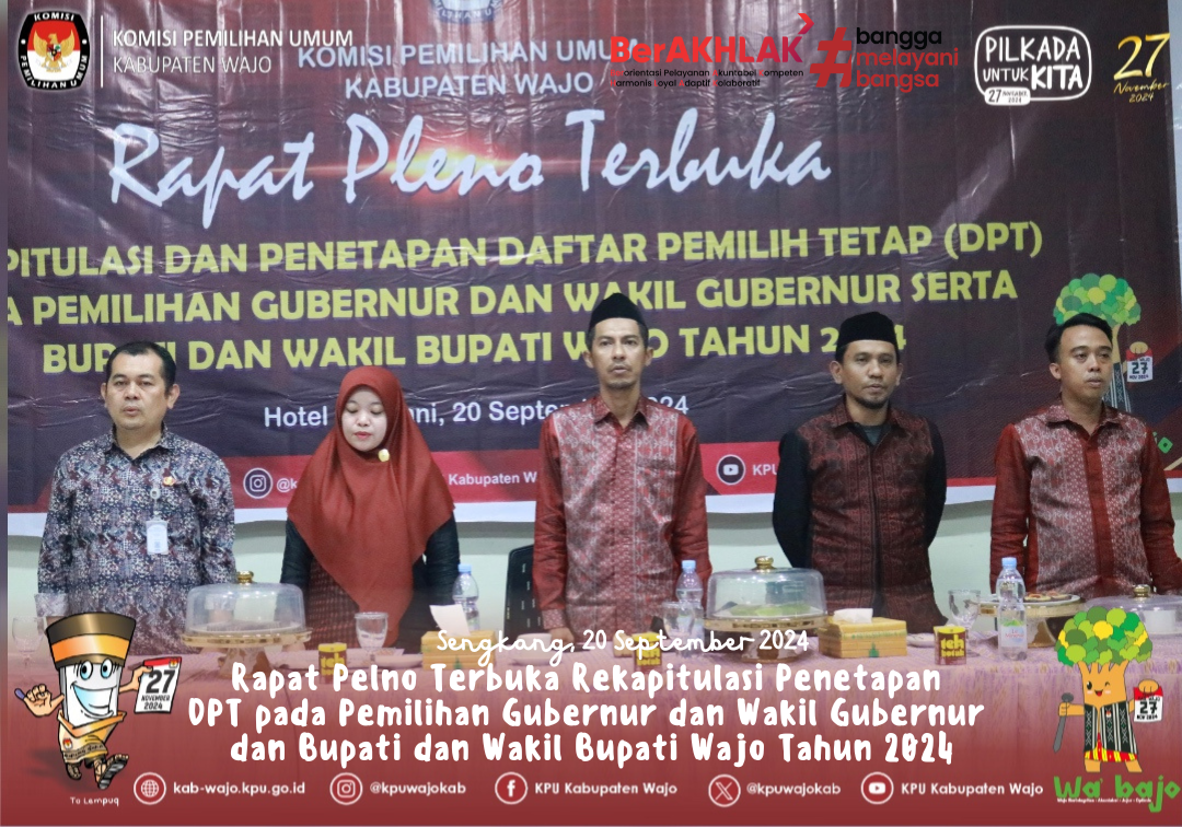 Komisi Pemilihan Umum Kabupaten Wajo melaksanakan Rapat Pleno Terbuka Rekapitulasi Penetapan Daftar Pemilih Tetap (DPT) Tingkat Kab. Wajo pada Pemilihan Gubernur dan Wakil Gubernur dan Bupati dan Wakil Bupati Wajo Tahun 2024, Jumat 20/9/2024.