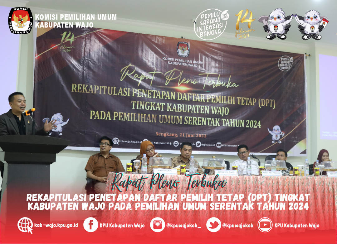 Komisi Pemilihan Umum Kabupaten Wajo melaksanakan Rapat Pleno Terbuka Rekapitulasi Penetapan Daftar Pemilih Tetap (DPT) Tingkat Kab. Wajo pada Pemilu Tahun 2024, Rabu, 21/6/2023.