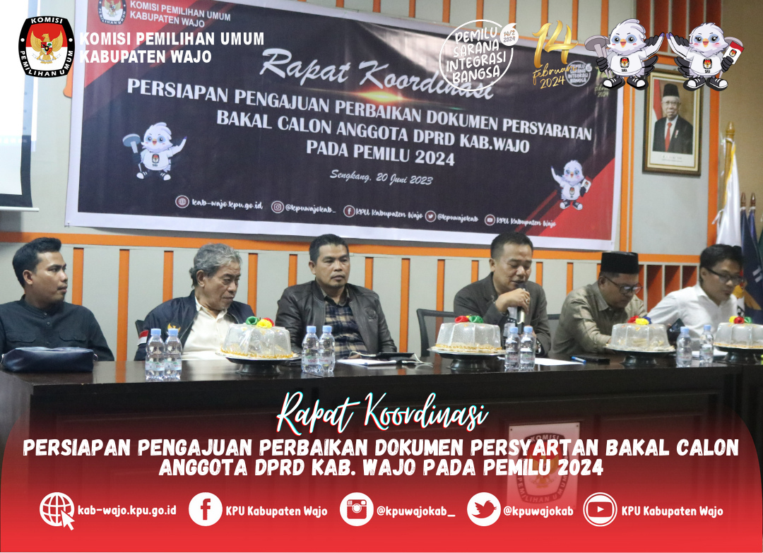 Jelang berakhirnya masa Verifikasi Administrasi dokumen persyaratan bakal calon anggota DPRD Kab. Wajo, Komisi Pemilihan Umum Kab. Wajo menggelar rapat koordinasi bersama Partai Politik di Aula Kantor KPU Wajo, Selasa, 20/06/2023