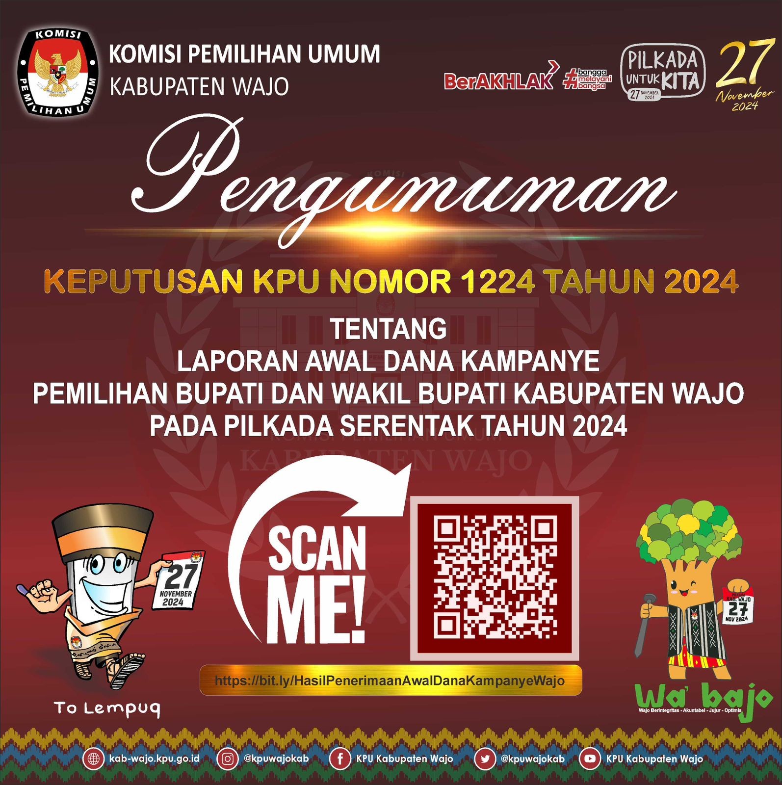 Pengumuman Keputusan KPU Nomor 1224 Tahun 2024 Tentang Laporan Awal Dana Kampanye Pemilihan Bupati dan Wakil Bupati Kabupaten Wajo pada Pilkada serentak tahun 2024 dapat disimak pada QR Code atau pada link berikut ?? Klik Disini