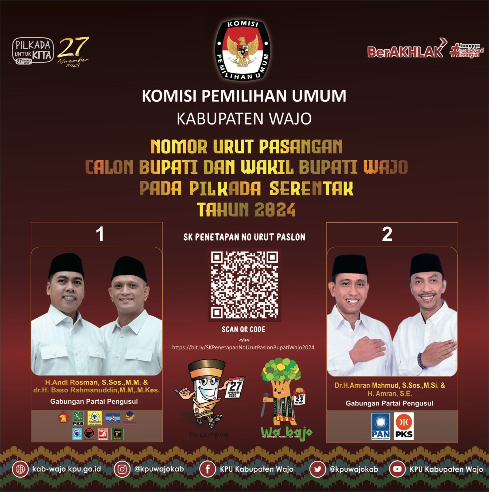 SK Penetapan Nomor Urut Pasangan Calon Peserta Pemilihan Bupati dan Wakil Bupati Wajo Tahun 2024 dapat di simak pada link berikut ?? (Klik Disini)