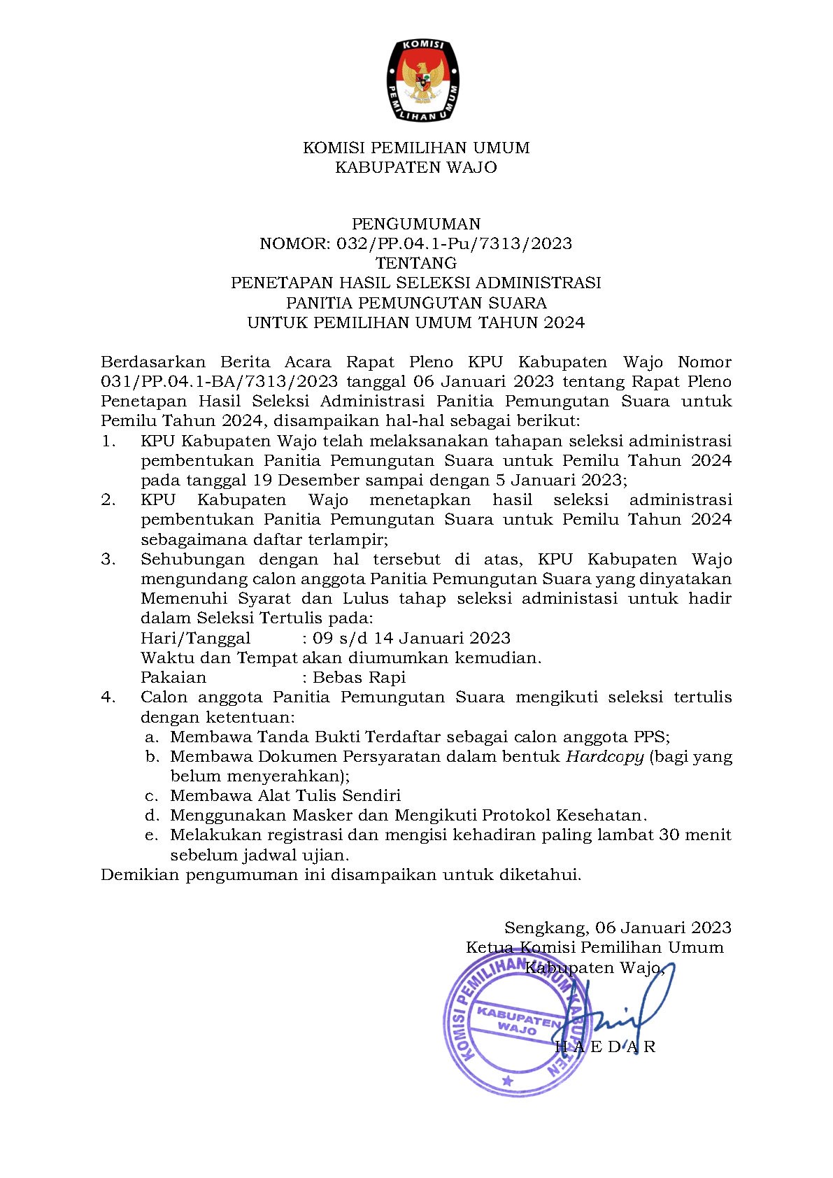 Pengumuman Komisi Pemilihan Umum Kabupaten Wajo Nomor 032/PP.04.1-Pu/7313/2023 Tentang Penetapan Hasil Seleksi Administrasi Panitia Pemungutan Suara Untuk Pemilihan Umum Tahun 2024 Jumat, 06 Januari 2023 00:00 1826 Pengumuman Komisi Pemilihan Umum Kabupaten Wajo Nomor 032/PP.04.1-Pu/7313/2023 Tentang Penetapan Hasil Seleksi Administrasi Panitia Pemungutan Suara Untuk Pemilihan Umum Tahun 2024 Bagikan: Dilihat 1,826 Kali.