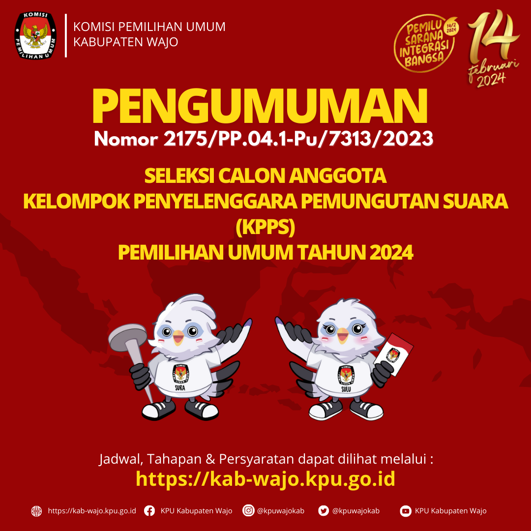 Dalam rangka pembentukan Kelompok Penyelenggara Pemungutan Suara (KPPS) Untuk Pemilihan Umum Tahun 2024, Komisi Pemilihan Umum Kabupaten Wajo mengundang Warga Negara Indonesia yang memenuhi persyaratan untuk mendaftarkan diri menjadi Anggota KPPS untuk Pemilihan Umum Tahun 2024.