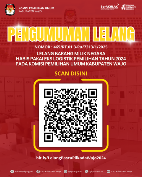 Pengumuman Lelang Nomor :465/RT.01.3-Pu/7313/1/2025 Tentang Pelaksanaan Lelang Barang Milik Negara Eks Logistik Pemilihan Tahun 2024 berupa Surat Suara, Kotak Suara dan Bilik Suara dengan perantaraan KPKNL Parepare. Selengkapnya dapat klik LINK DISINI!