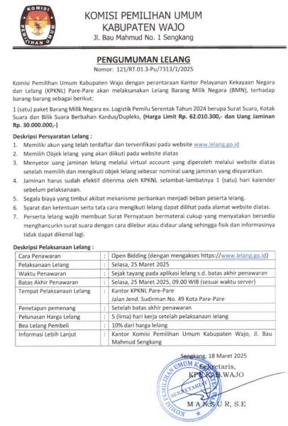 Pengumuman Lelang Eks Logistik Pemilu Serentak Tahun 2024