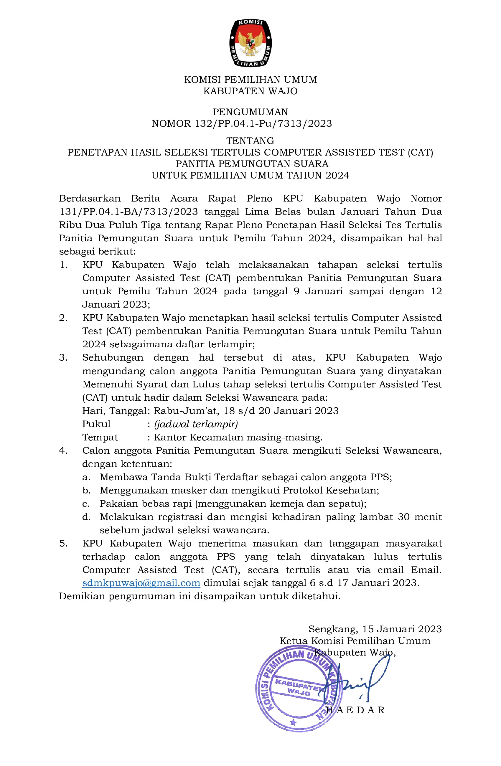 Pengumuman Lulus Tes Tertulis Calon Anggota PPS Pemilu Tahun 2024 Senin, 16 Januari 2023 00:00 1317 Pengumuman Komisi Pemilihan Umum Kabupaten Wajo Nomor 132/PP.04.1-Pu/7313/2023 Tentang Penetapan Hasil Seleksi Tertulis Computer Assisted Test (CAT) Panitia Pemungutan Suara Untuk Pemilihan Umum Tahun 2024 Bagikan: Dilihat 1,317 Kali.
