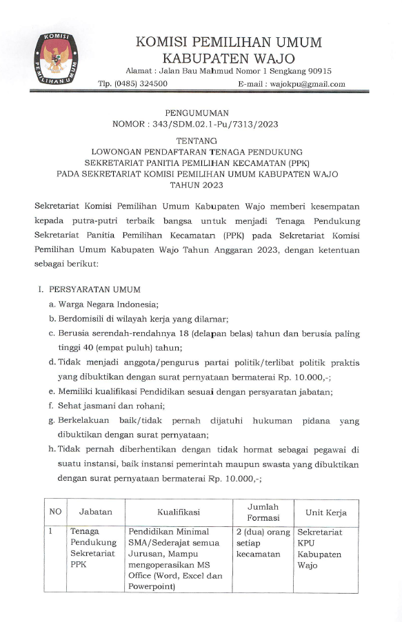 Pengumuman Nomor 343/SDM.02.1-Pu/7313/2023 Tentang Lowongan Pendaftaran Tenaga Pendukung Sekretariat Panitia Pemilihan Kecamatan (PPK) Pada Sekretariat KPU Kabupaten Wajo Tahun 2023 Rabu, 01 Maret 2023 00:00 1312 Pengumuman Nomor 343/SDM.02.1-Pu/7313/2023 Tentang Lowongan Pendaftaran Tenaga Pendukung Sekretariat Panitia Pemilihan Kecamatan (PPK) Pada Sekretariat KPU Kabupaten Wajo Tahun 2023 Form Pendaftaran Bagikan: Dilihat 1,312 Kali.