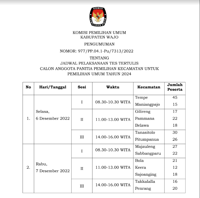 Pengumuman Nomor 977/PP.04.1-Pu/7313/2022 Tentang Jadwal Pelaksanaan Tes Tertulis Calon Anggota Panitia Pemilihan Kecamatan Untuk Pemilu Tahun 2024 Senin, 05 Desember 2022 00:00 1394 Pengumuman Nomor 977/PP.04.1-Pu/7313/2022 Tentang Jadwal Pelaksanaan Tes Tertulis Calon Anggota Panitia Pemilihan Kecamatan Untuk Pemilihan Umum Tahun 2024 Bagikan: Dilihat 1,394 Kali.
