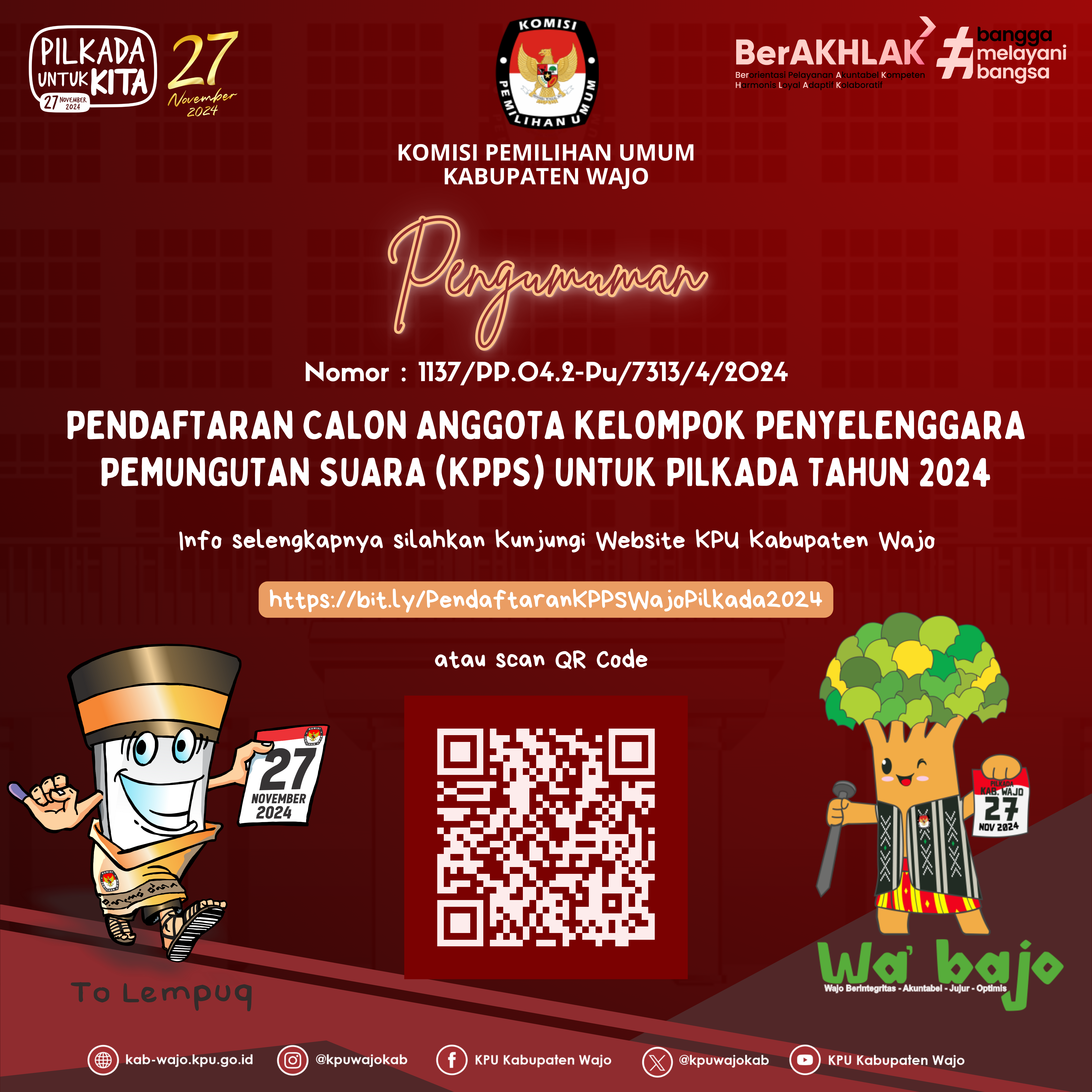 Pengumuman Nomor:1137/PP.04.2-Pu/7313/4/2024 tentang Pendaftaran Calon Anggota Kelompok Penyelenggara Pemungutan Suara untuk Pilkada Tahun 2024 dapat dilihat dan di Unduh pada Link berikut (Klik Disini)