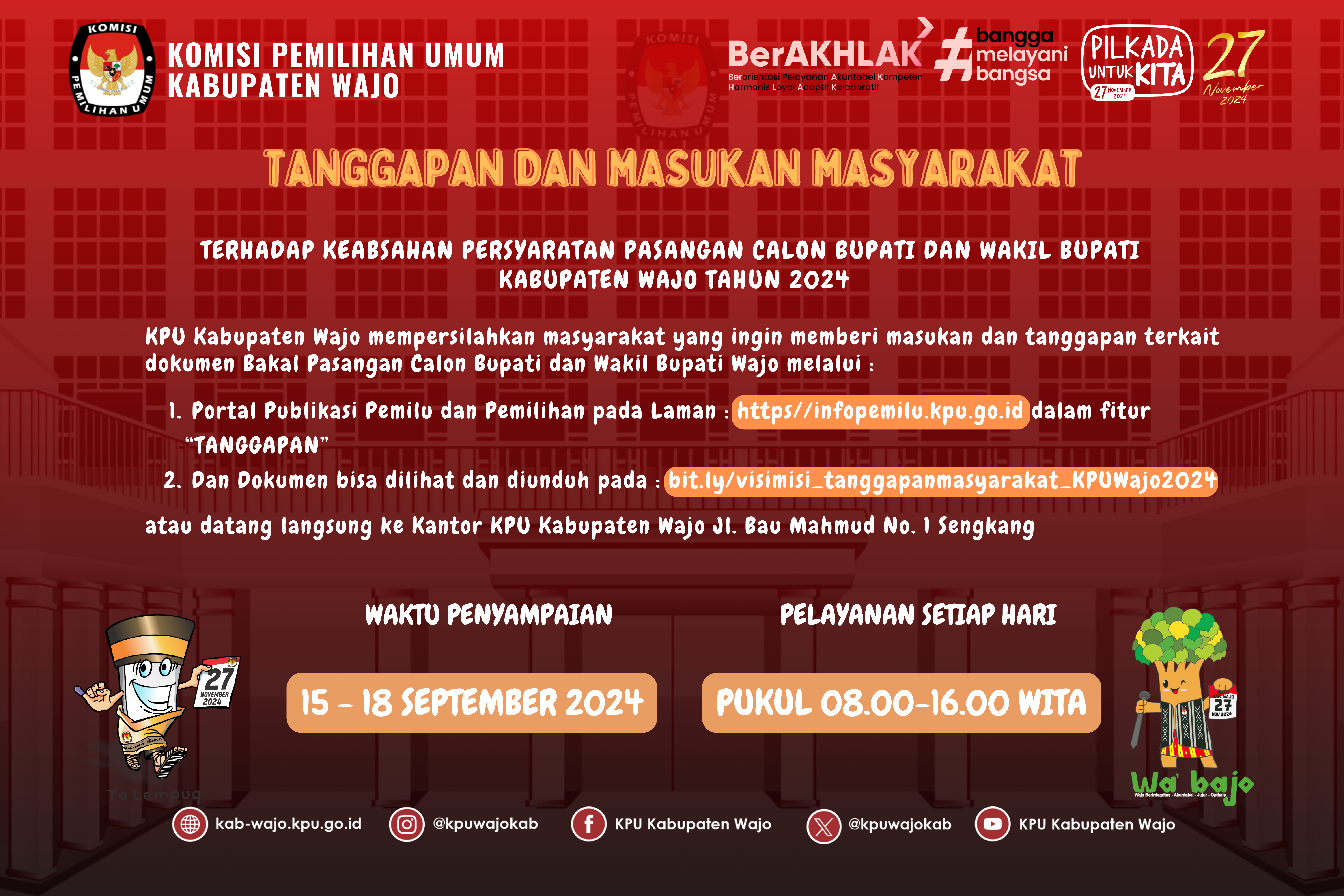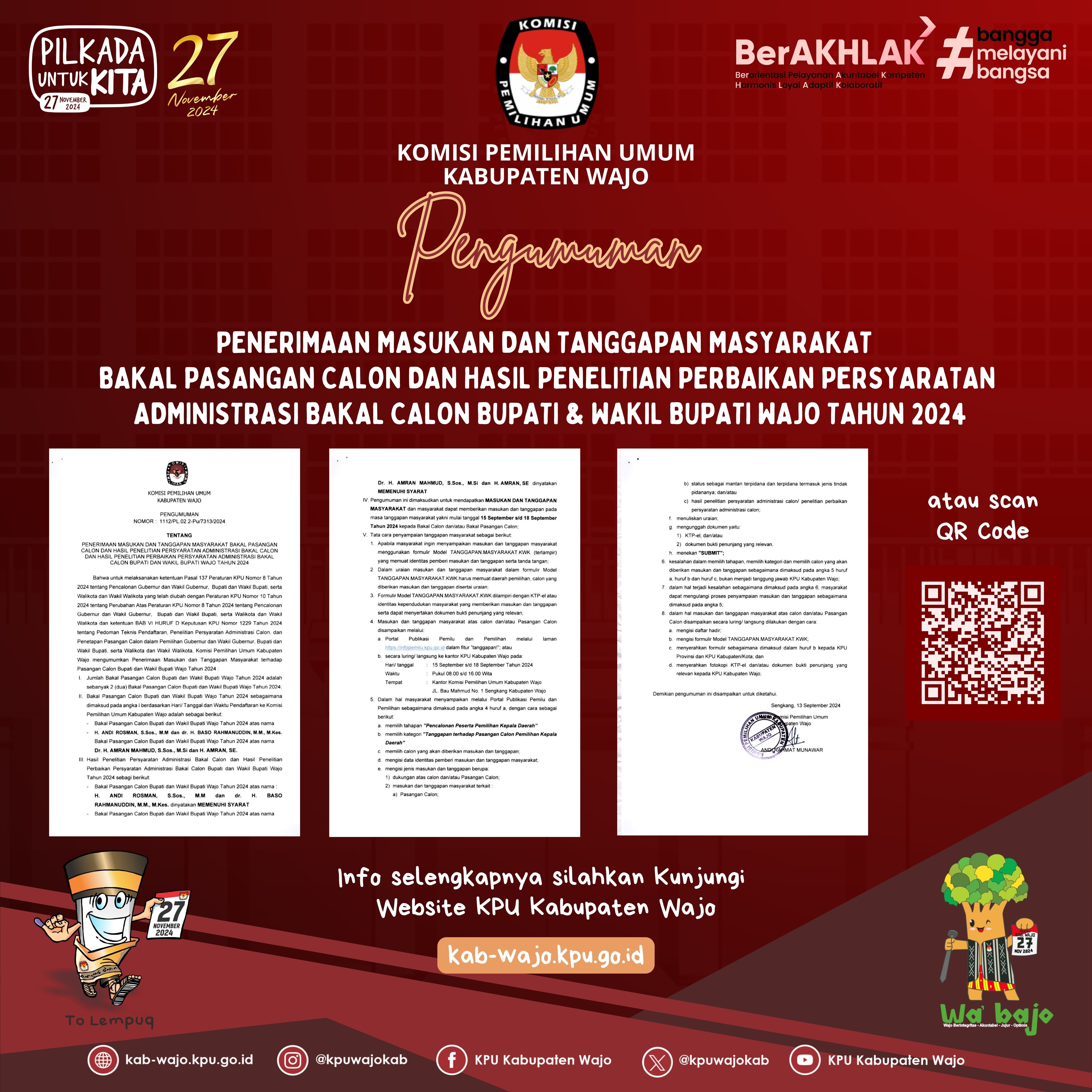 Pengumuman Penerimaan Masukan dan Tanggapan Masyarakat Bakal Pasangan Calon Bupati dan Wakil Bupati Wajo Tahun 2024