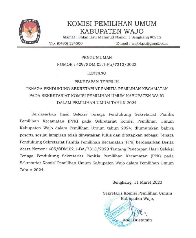 Pengumuman Penetapan Terpilih Tenaga Pendukung Sekretariat Panitia Pemilihan Kecamatan Pada Sekretariat KPU Kabupaten Wajo Pada Pemilu 2024 Sabtu, 11 Maret 2023 00:00 1492 Pengumuman Komisi Pemilihan Umum Nomor 409/SDM.02.1-Pu/7313/2023 Tentang Penetapan Terpilih Tenaga Pendukung Sekretariat Panitia Pemilihan Kecamatan Pada Sekretariat KPU Kabupaten Wajo Pada Pemilu 2024 Bagikan: Dilihat 1,492 Kali.