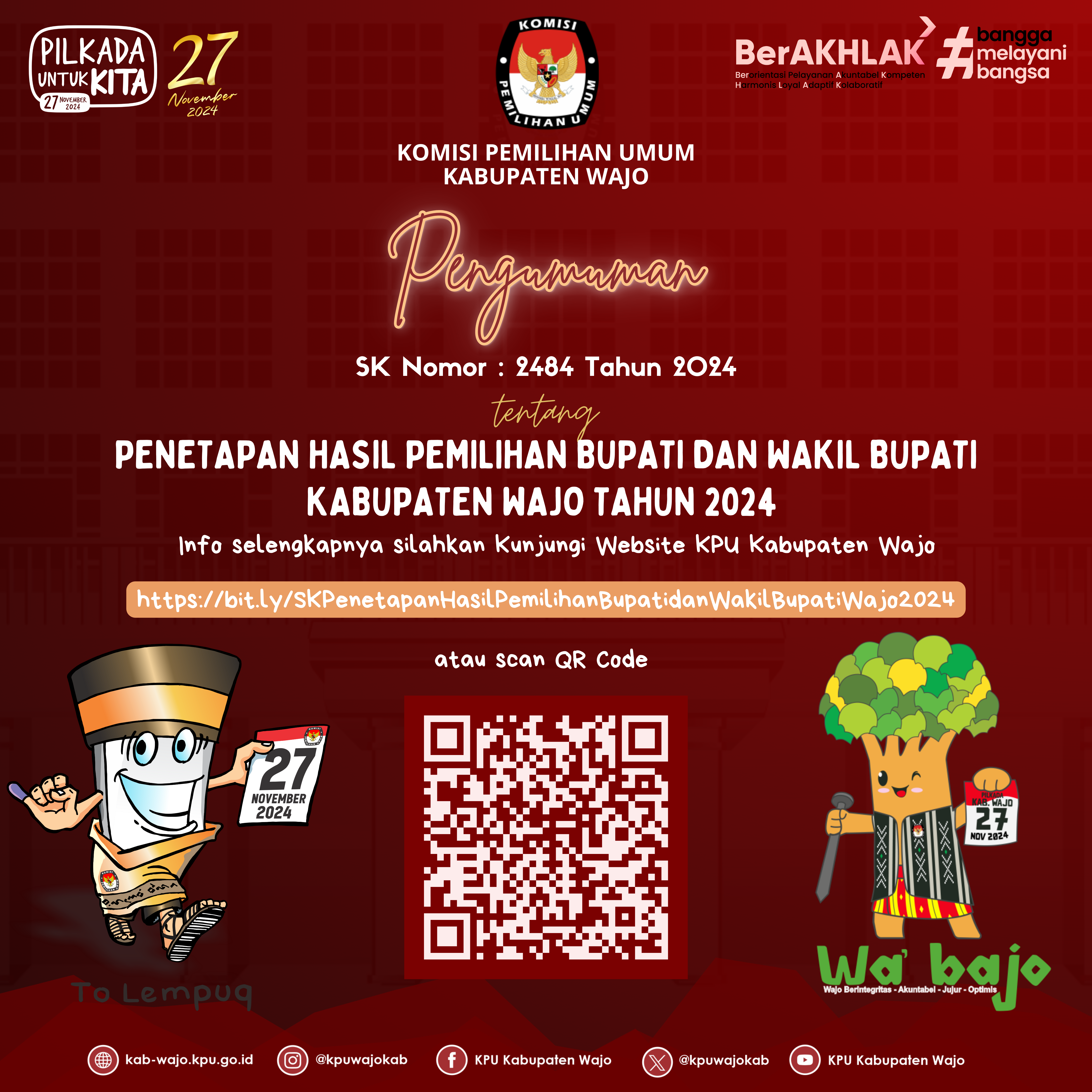 KEPUTUSAN KOMISI PEMILIHAN UMUM KABUPATEN WAJO NOMOR 2484 TENTANG PENETAPAN HASIL PEMILIHAN BUPATI DAN WAKIL BUPATI KABUPATEN WAJO TAHUN 2024 dapat disimak pada link berikut ?? (Klik Disini)