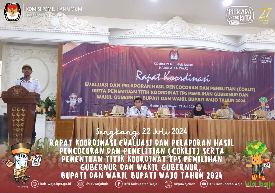 "KPU WAJO" menyelenggarakan Rapat Koordinasi Evaluasi dan Pelaporan Hasil Pencocokan dan Penelitian (Coklit) dan Penentuan Titik Koordinat TPS Pemilu 2024 di Gedung Darmawan Sengkang, yang di Hadiri olehKetua KPU Kabupaten Wajo, Anggota KPU Divisi Data dan Informasi, Anggota KPU Divisi Teknis, Admin Dinas Kependudukan dan Catatan Sipil Kab. Wajo, Anggota Bawaslu Kabupaten Wajo, 190 Panitia Pemungutan Suara dan 14 Panitia Pemilihan Kecamatan yang membidangi Data Pemilih Pilkada Serentak 2024 . Kegiatan ini di dibuka oleh Ketua KPU Kab.Wajo Andi Rahmat Munawar.