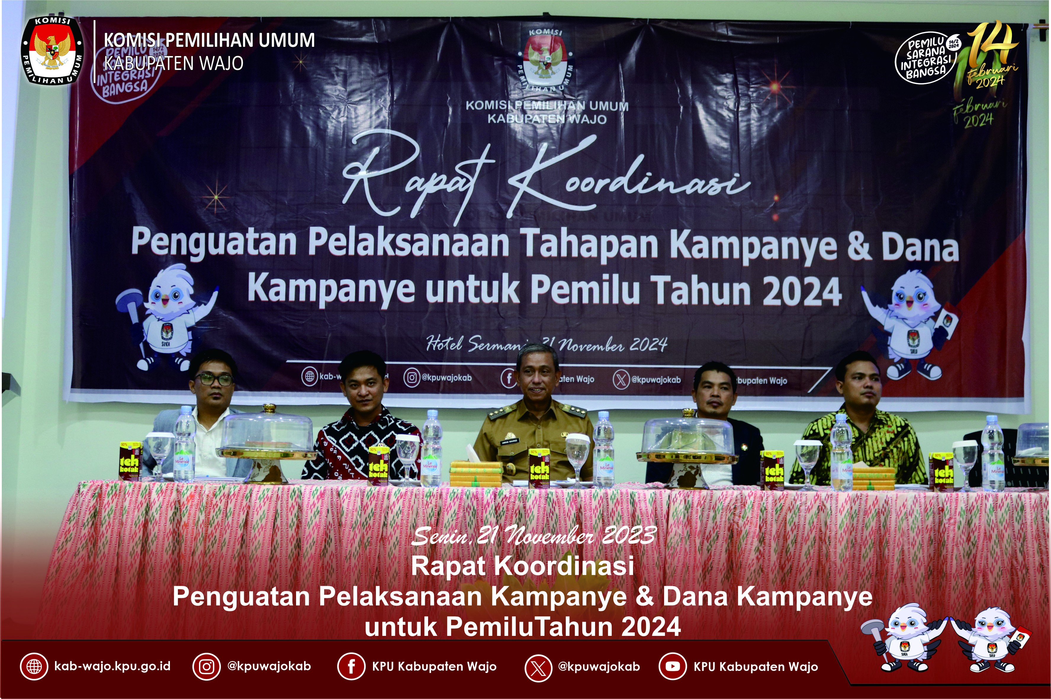 Komisi Pemilihan Umum (KPU) Kabupaten Wajo menyelenggarakan Rapat Koordinasi tahapan Kampanye dan Dana Kampanye pada Pemilihan Umum (Pemilu) Tahun 2024 di Hotel Sermani Sengkang pada Selasa, 21 November 2023.