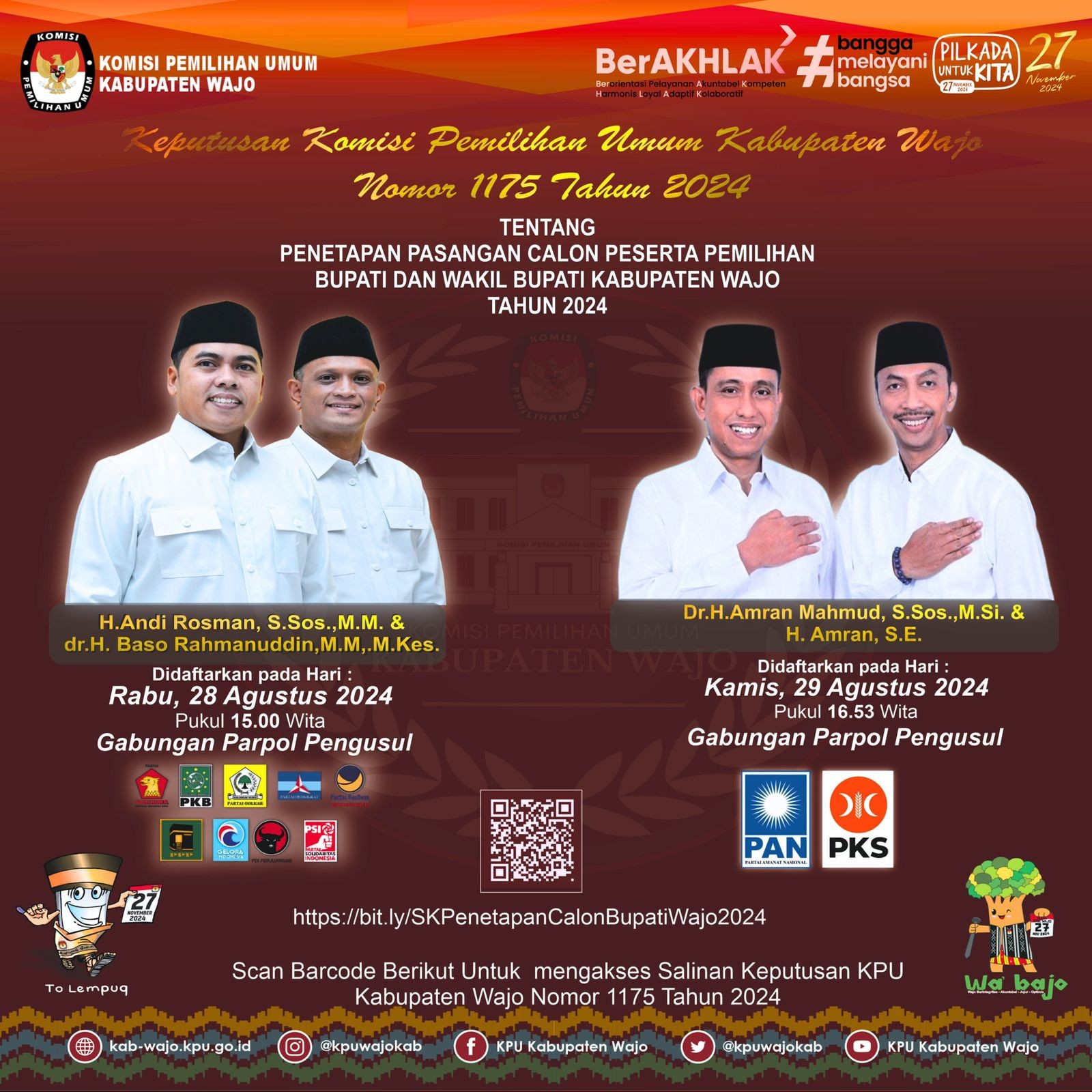Surat Keptusan KPU Kabupaten Wajo Nomor 1175 Tahun 2024 tentang Penetapan Pasangan Calon Peserta Pemilihan Bupati dan Wakil Bupati Wajo Tahun 2024 dapat di simak pada Link berikut ?? (Klik Disini)