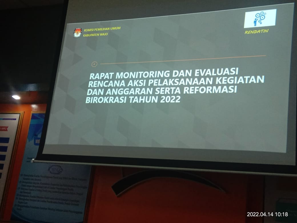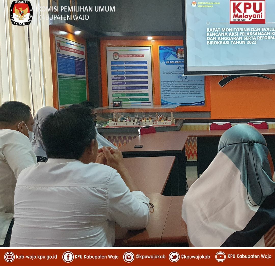 KPU Wajo_Rapat Monitoring dan Evaluasi Pelaksanaan Kegiatan dan Anggaran serta Rencana Aksi Reformasi Birokrasi dilingkungan KPU Kab.Wajo dilaksanakan pada hari Kamis, 14 Februari 2022 yang bertempat di Rumah Pintar Pemilu (RPP).